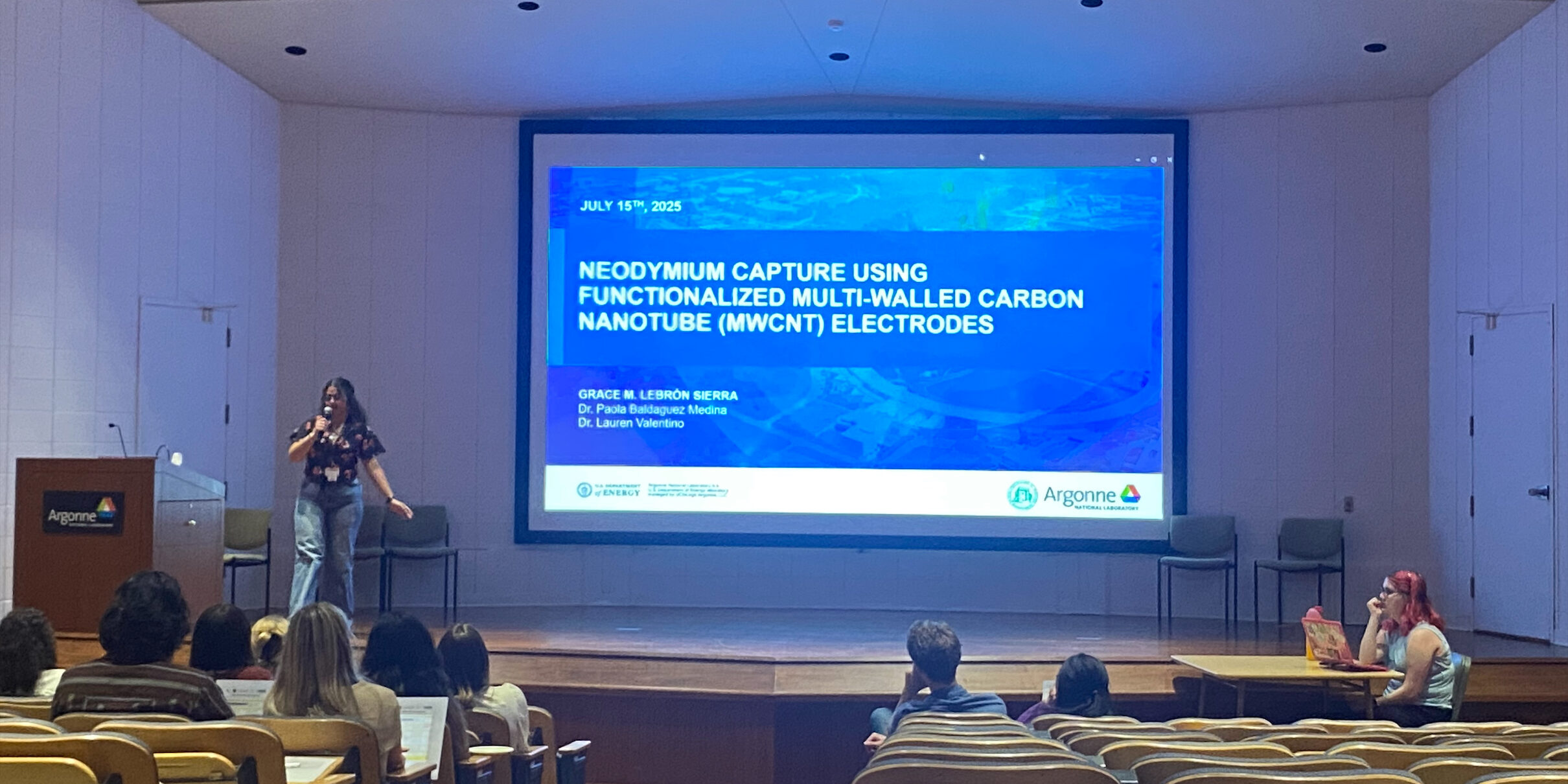 This summer, Grace M. Lebron Sierra, an undergraduate researcher in our group, has been working at Argonne National Laboratory on the recovery of rare earth elements (REEs) alongside Prof. Baldaguez Medina, Dr. Lauren Valentino, and Dr. Yupo Lin. As part of her internship, Grace contributed to ongoing research on electrochemical separation techniques for critical materials. She also represented our work at the Ignite Off! competition, where she delivered a five-minute talk highlighting our research to a broad audience of scientists and professionals. We’re proud of her accomplishments and look forward to seeing her continued growth in the field!