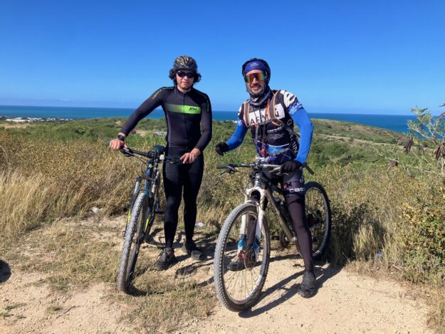 Corrida de 13 Km con 5 participantes rodando varias vueltas por la pista MTB frente al faro Punta Higuera en Rincón.