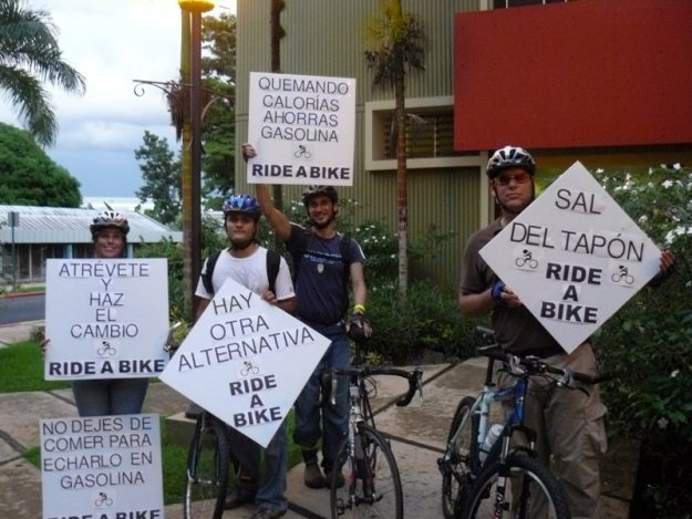 Promoviendo el uso de la bicicleta utilizando pancartas con mensajes de concienciación en momento en que el tráfico ha colapsado en la entrada principal (La Vita) del Recinto Universitario de Mayagüez (RUM).