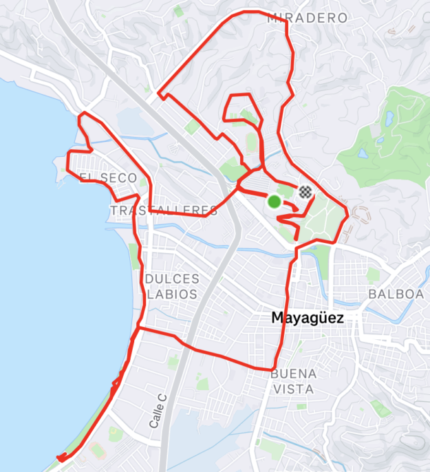 Vuelta recreativa al atardecer el viernes, 26 de enero de 2024 saliendo desde el Recinto Universitario de Mayagüez con 4 participantes y regresando. Ver la ruta del recorrido de 16 Km.