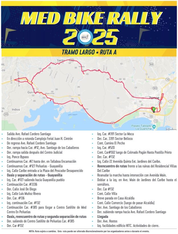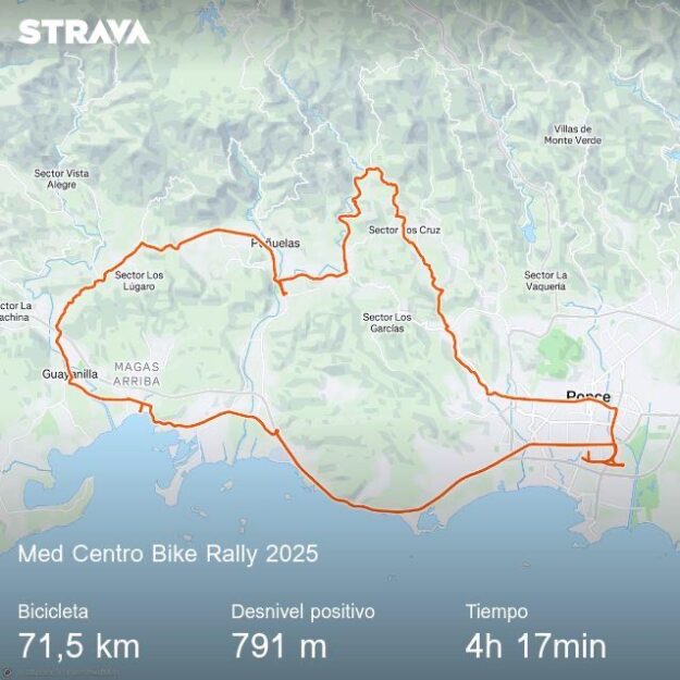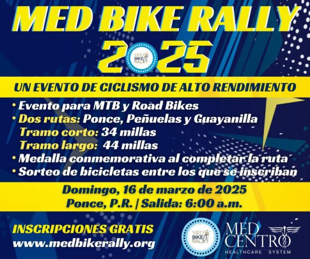 Décimo tercera edición de la vuelta ciclista Med Bike Rally el domingo, 16 de marzo de 2025 organizada por Med Centro. Con 4 participantes, 3 en bicicleta de montaña y uno en bicicleta de calle, en la ruta larga Ponce – Peñuelas – Guayanilla; ver la ruta larga de 71 Km. Comunicado oficial del evento.