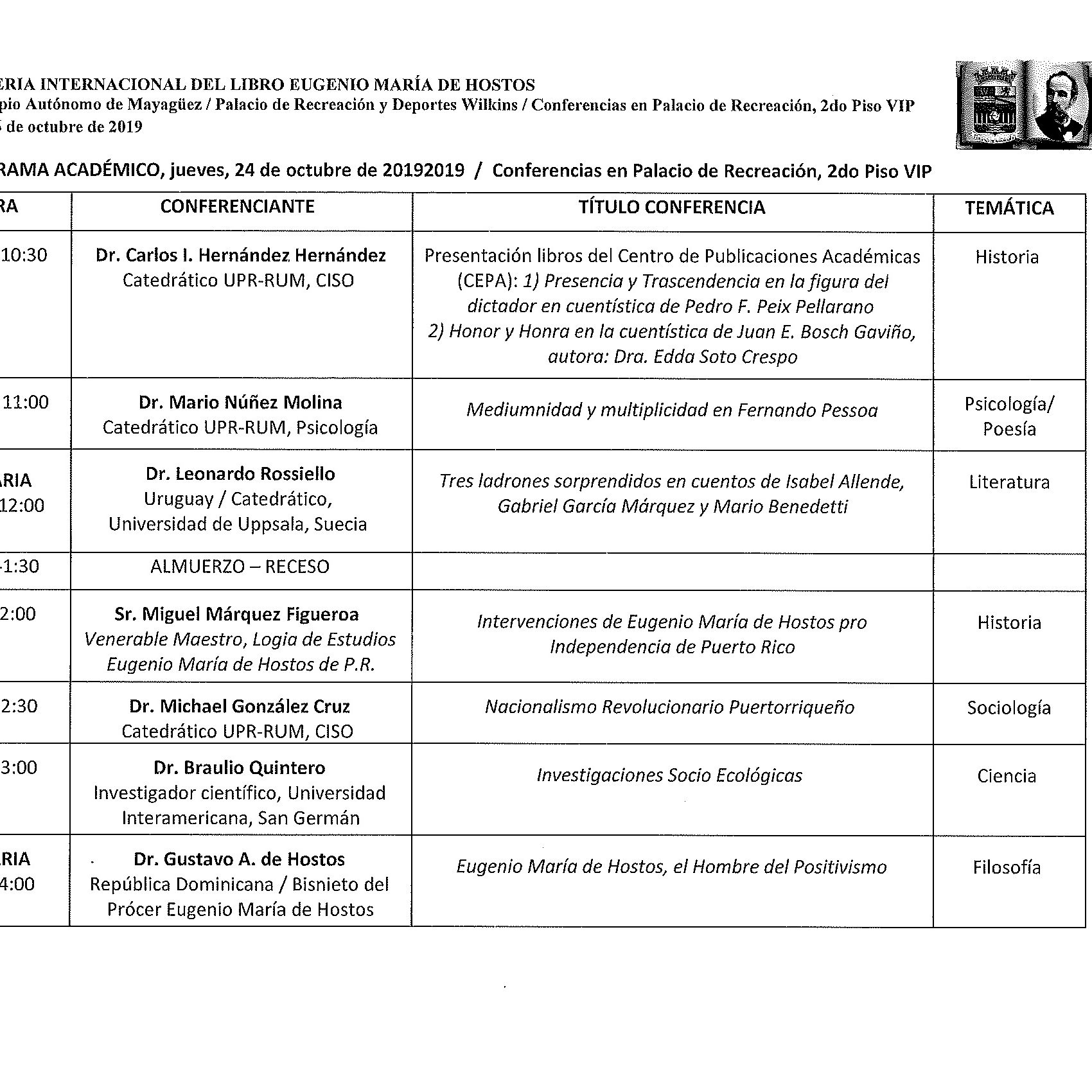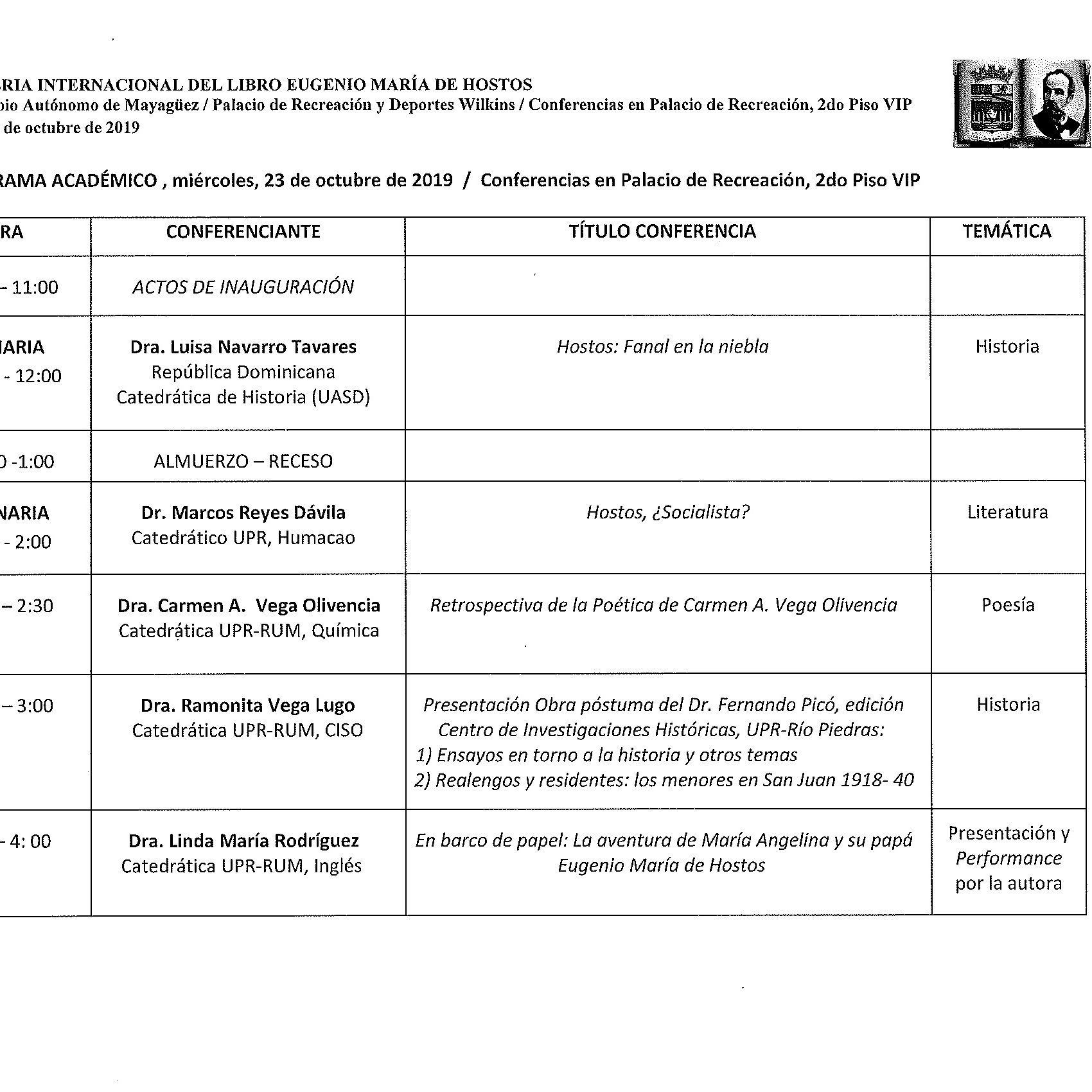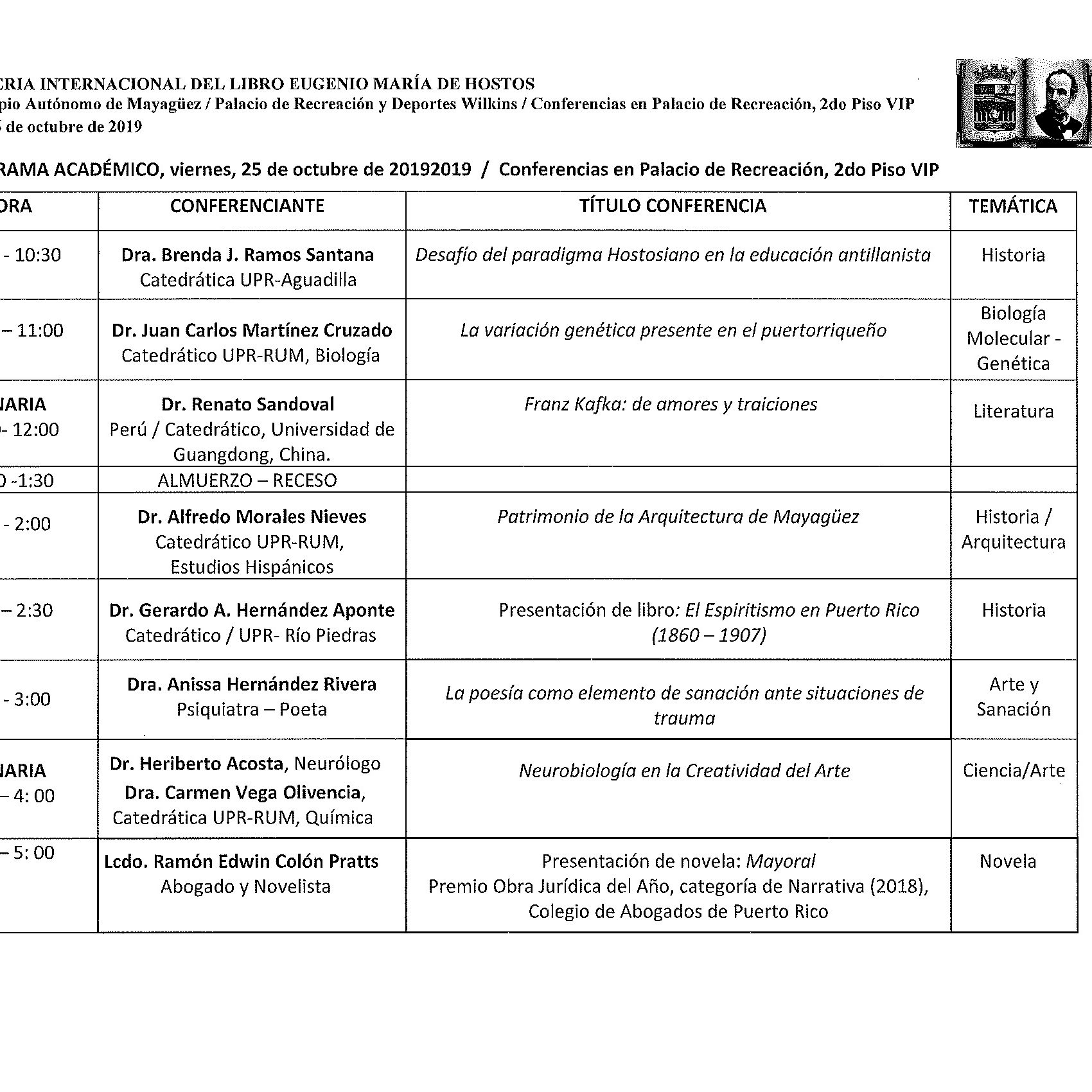 se destaca la estrecha colaboración del RUM desde Rectoría, el Dr. Rullán Toro y sus ayudantes, particularmente la Sra. Rocío Zapata como enlace con todos. Estaremos representados por miembros de nuestro personal docente y no docente, quienes participan de diversas maneras desde las exhibiciones: Fac Ingeniería, estudiantes Banda Colegial, Ciencia sobre Ruedas, Librería colegial. Reservo especial atención al Programa Académico en el que participo. Como verá hay un programa variado de conferencias que integran las ciencias con las Artes con invitados internacionales y nuestros especialistas locales, mayormente de nuestra Facultad de Artes y Ciencias: Ciencias Sociales, Inglés, Biología, Química, Psicología, Estudios Hispánicos.