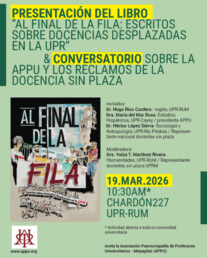 El Centro de Investigación Social Aplicada (CISA) les invita a la presentación del libro “Al final de la fila: escritos sobre docencias desplazadas en la UPR” y a un conversatorio posterior sobre la APPU y los reclamos de la docencia sin plaza, auspiciadas por la APPU RUM. La presentación del libro y el conversatorio estará a cargo de la Dra. María del Mar Rosa, el Dr. Héctor López Sierra, el Dr. Hugo Ríos Cordero y la Dra. Yuitza T. Martinez Rivera. La actividad se llevará a cabo el jueves 19 de marzo del 2026 a las 10:30 a.m. en Chardon 227.