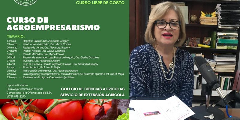 En la entrevista de hoy conversamos con la Dra. Gladys González, Catedrática en el Departamento de Economía Agrícola y Sociología Rural en el Colegio de Ciencias Agrícolas del Recinto Universitario de Mayagüez. La Dra. González, nos habla sobre sobre unos cursos gratuitos sobre Agroempresarismo dirigido a Agricultores, ganaderos y veteranos. En la entrevista nos menciona sobre las diferentes fechas y lugares donde se ofrecerán los cursos, ademas de mencionarnos los temas a cubrir en los mismos.