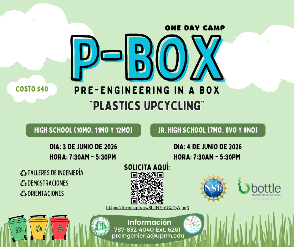 | Todas las ingenierias | Pre-Engineering in a Box (P-BOX) | El Decanato de Asuntos Académicos de Ingeniería informa que ofrecerá dos sesiones de mini-campamentos Pre-Engineering in a Box (P-BOX). El P-BOX tiene el propósito de atender a estudiantes que tienen interés en el área de la ingeniería pero que no lograron la admisión a algún campamento o que no pudieron participar de un campamento extenso en el RUM. Durante el día del P-BOX se ofrecerá: orientación de los programas de ingeniería, interesantes seminarios, talleres interactivos relacionadas con un tema de ingeniería. *Fechas del Campamento P-BOX 2026: P-Box - Engineering in Oceans: · 11 de abril de 2026 - "High School" (grados 10 al 12 actualmente) · 25 de abril de 2026 - "Junior High School" (grados 7 al 9 actualmente) P-Box - Plastics Uncycling: · 3 de junio 2026 - "High School" (grados 10 al 12 actualmente) · 4 de junio 2026 - "Junior High School" (grados 7 al 9 actualmente) Nota: Fechas sujetas a cambio. · Solicitud en Línea P-Box Oceans ya está abierta hasta el 31 de marzo de 2026. (O hasta que se llenen los espacios) · Solicitud en Línea P-Box Plastics está abierta desde el 1 de abril de 2026 al 30 de abril a las 8:00 am. (O hasta que se llenen los espacios) Costo: $40.00 | Para más información sobre el Campamento: Campamento P-BOX Solicitud del P-BOX Oceans PBOX Oceans Flyer Solicitud del P-BOX Plastics PBOX Plastics Flyer |