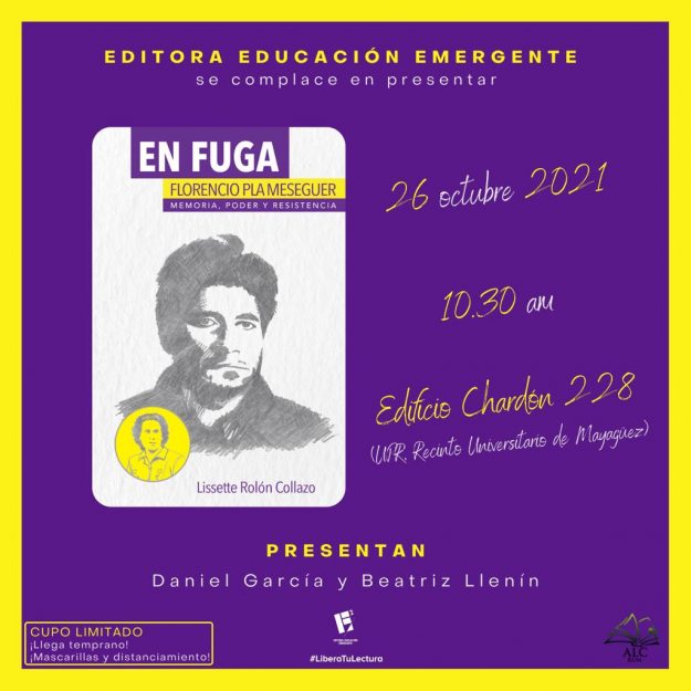 En Fuga: Florencio Pla Meseguer, Memoria, Poder y Resistencia 26 de octubre de 2021 a las 10:30 a.m. Chardón 228 En Fuga: Florencio Pla Meseguer, Memoria, Poder y Resistencia Presentan Daniel García y Beatriz Llenín