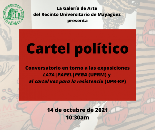 Conversatorio: “Cartel político“ El jueves, 14 de octubre a las 10:30 a.m. tendremos el conversatorio “Cartel político” en torno a la exposición Lata/Papel/Pega de BEMBA PR. Nos acompañarán Flavia Marichal Lugo, Directora del Museo de Historia, Antropología y Arte de la Universidad de Puerto Rico en Río Piedras y el profesor Ramón López de…