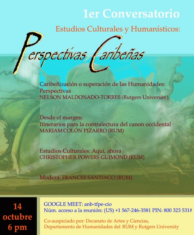 Conversatorio: Estudios Culturales y Humanísticos Perspectivas Caribeñas Co-auspiciado por el Decanato de Artes y Ciencias, el Departamento de Humanidades (UPR-M) y Rutgers University 14 de octubre 2021, 6:00 p.m. Enlace: meet.google.com/anb-tfpe-cio Número de acceso a la reunión: (US) +1 567-246-3581 PIN: 800 323 531#