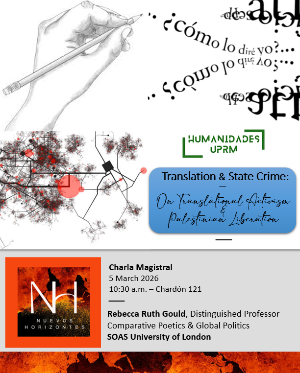 Translation and State Crime: On Translational Activism & Palestinian Liberation — Charla Magistral: Translation and State Crime: On Translational Activism & Palestinian Liberation Rebecca Ruth Gould, Distinguished Professor Comparative Poetics & Global Politics SOAS University of London — 5 de marzo de 2026 CH 121 – 10:30 —