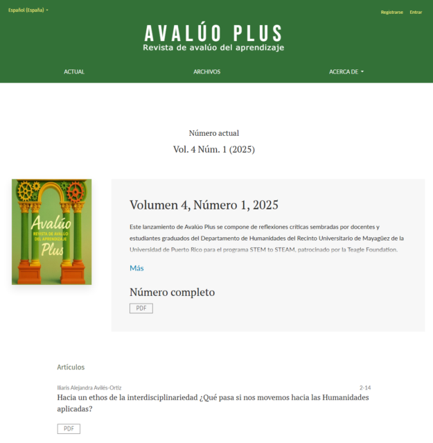 Avalúo Plus, Volumen 4, Número 1, 2025 — Avalúo Plus, Volumen 4, Número 1, 2025 Este lanzamiento de Avalúo Plus se compone de reflexiones críticas sembradas por docentes y estudiantes graduados del Departamento de Humanidades del Recinto Universitario de Mayagüez de la Universidad de Puerto Rico para el programa STEM to STEAM, patrocinado por la…
