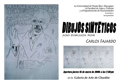 La directora de la Galería de Arte del departamento de Humanidades (HUMA) del Recinto Universitario de Mayagüez (RUM), Dra. Laura Bravo invita a la comunidad universitaria a la apertura de la exposición Dibujos sintéticos del artista Carlos Fajardo. Se llevará a cabo el jueves, 16 de marzo a las 7:30 p.m. en la Galería de Arte ubicada en el edificio Chardón.