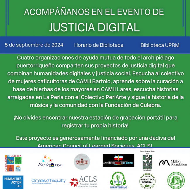 EnglishEspañolEnglish On Thursday, September 5, 2024 at 10:30 in the General Library’s Conference Room (Sala A) digital humanities projects based on oral narratives collected by OHL community partners will be presented under the auspices of the project “Speaking in the Silences: Constructing Community Archives Throughout the Puerto Rican Archipelago” of the American Council of Learned…