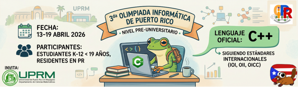 La Olimpiada informática de Puerto Rico es un proceso de adiestramiento, competencia y selección anual de estudiantes en solución de problemas y programación de computadoras. Eres elegible para participar si eres estudiante no universitario, menor de 19 años y residente en la isla.