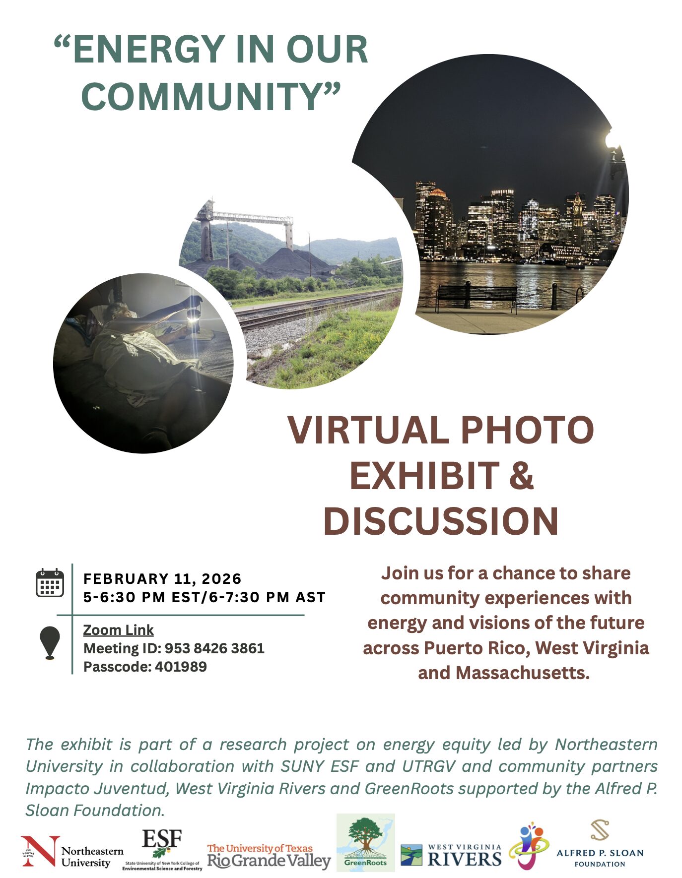 Los organizadores invitaron a la comunidad universitaria y al público general a participar del conversatorio virtual Energy in our community, que se celebrará el martes, 11 de febrero, de 6:00 a 7:30 p.m. La actividad ofrecerá un espacio para compartir experiencias comunitarias sobre energía y dialogar sobre visiones de futuro entre participantes de Puerto Rico, West Virginia y Massachusetts. El encuentro se realizará a través de la plataforma Zoom.
