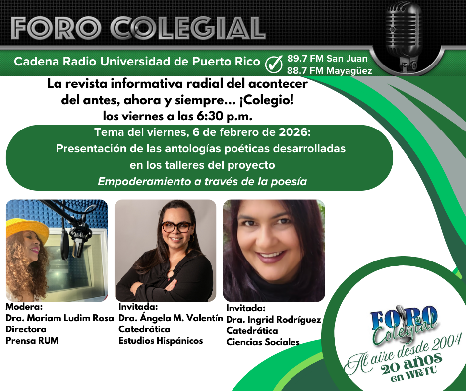 6 de febrero de 2026-Las doctoras Ángela Valentín, de Estudios Hispánico e Ingrid Rodríguez, de Ciencias Sociales, nos hablan sobre las antologías poéticas que desarrollaron durante el proyecto Empoderamiento a través de la poesía, con féminas de comunidades de Adjuntas y Lajas.