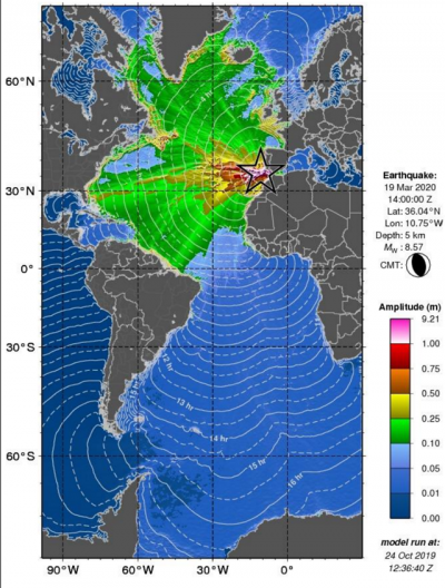 Ahora hablemos de los tele-tsunamis. Los tele-tsunamis son tsunamis que están a una distancia mayor de 1000 km de nuestra región. En el Caribe el único evento registrado de este tipo de tsunami fue el terremoto de Lisboa en 1755. Las olas del tsunami tardaron 9 horas en llegar al Caribe donde se reportó un impacto en la Antigua. No hay registro de este tsunami tocando a Puerto Rico. Una ventaja de los tele-tsunamis es que le da tiempo suficiente a las personas para desalojar, a diferencia de los tsunamis locales que solo les da a los residentes una ventana de varios minutos.