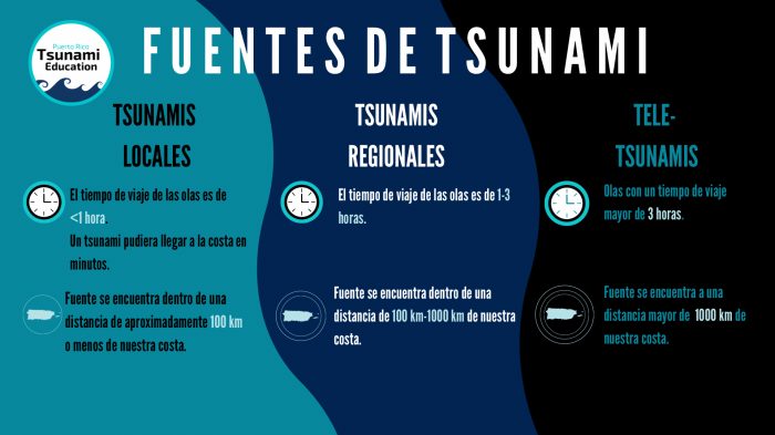 De las tres (3) fuentes de tsunami mencionadas anteriormente, los tsunamis locales son los más peligrosos. Estos pueden llegar a la costa en cuestión de minutos, evitando que las autoridades tengan tiempo suficiente para emitir las alertas pertinentes. Por esta razón, se presta atención a las señales naturales de tsunami como: terremotos de gran magnitud, cambios anormales del nivel del agua o un rugido en alta mar. Si escucha, ve o siente alguna de estas señales, se recomienda evacuar las zonas expuestas y buscar un lugar alto en el menor tiempo posible.