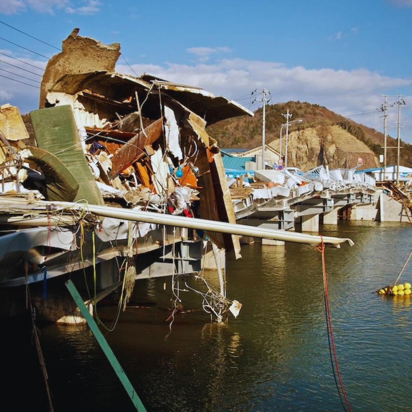 The water contains amounts of forces that destroys structures. The Tohoku tsunami is an example because the water destroyed all manmade structures, they were washed away by the waves. The damage caused by a tsunami is related to the direct impact of the flood, the wave interaction with structures and the rapid erosion. It is important to mention that tsunamis carry debris that could be fatal. As water recedes and comes back, the debris start to clumps at or near the coast such as a boat stranded inland.